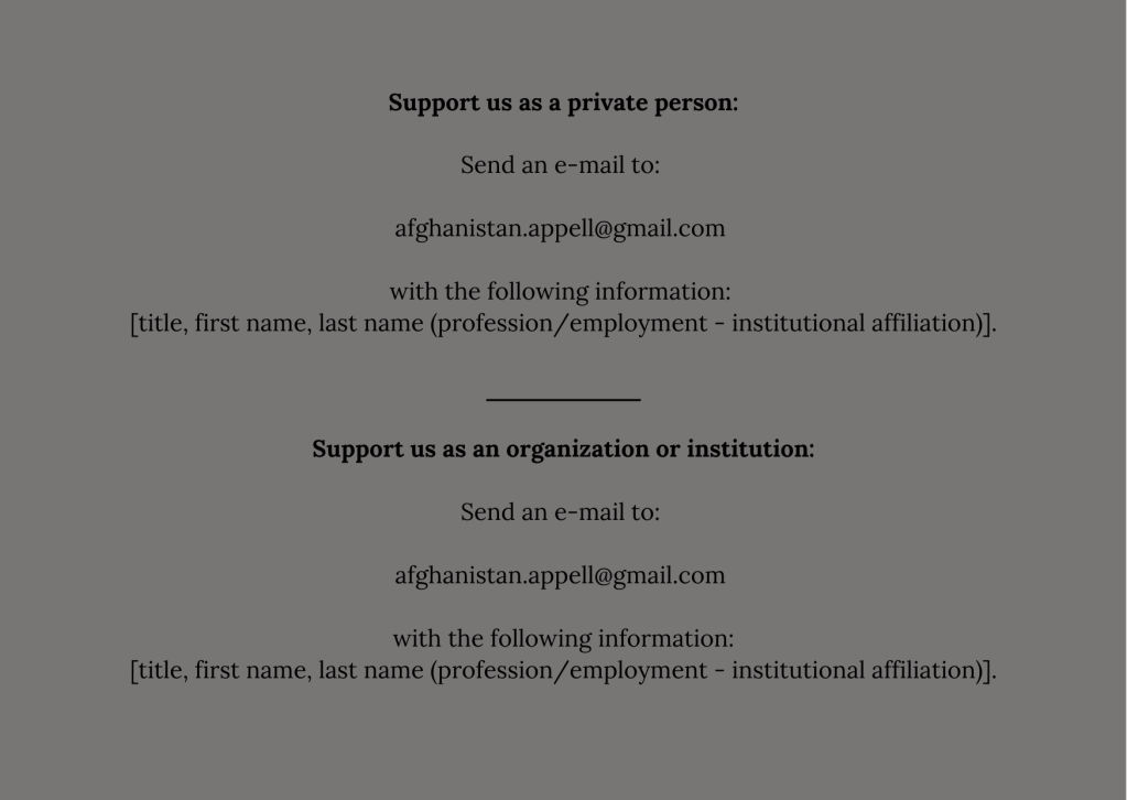 Wir als (nicht nur diasporische, afghanische) Kulturschaffende, Wissenschaftler:innen und im zivilen Bereich Tätige, möchten die politisch Verantwortlichen in Afghanistan dazu auffordern, in dieser schweren und heiklen Situation besondere Rücksicht walten zu lassen. Wir fordern die politisch Verantwortlichen dazu auf, die afghanische Gesellschaft, AUSNAHMSLOS und unter Berücksichtigung der INTERSEKTIONAL geprägten gesellschaftlichen Bedingungen, an dem politischen Prozess teilnehmen zu lassen und die Rechte ALLER afghanischen Bürger:innen an ALLEN Orten des Landes zu unterstützen, zu stärken und zu SCHÜTZEN. Die vielfältige, wundervolle, afghanische Bevölkerung ist einerseits des ständigen Krieges und Elends leid; die jüngste Geschichte Afghanistans hat andererseits mit dem nahezu immerwährenden Krieg und den damit einhergehen Leiderfahrungen das Fundament für eine offene, kreative Gesellschaft gestärkt, um trotz einer langen und schweren Trauerarbeit, einer schönen Zukunft und einem Werden in der Weltgemeinschaft entgegensehen und erarbeiten zu wollen. Wir möchten dazu auffordern, die Menschen in diesem Land in jeder Hinsicht zu schützen, jeglichen Krieg und jede Auseinandersetzung mit der besten Waffe, die der Menschheit je zugänglich werden konnte und bleibt, MIT DEM WORT / MIT DEM STIFT, auszutragen und die SPRECHMÖGLICHKEIT, ausnahmslos, ALLEN Menschen in Afghanistan in INTERSEKTIONALER Weise zugänglich zu machen. Niemandem darf ungestraft Unrechtes geschehen, niemand soll in materieller und körperlicher Hinsicht zu Schaden kommen. Wir fordern dazu auf und verlangen, dass in verantwortlicher Weise mit dem Gut des Menschseins und aller Lebewesen umgegangen wird, so dass, trotz allem und allem zum Trotz, eine friedliche, blühende und inspirierende neue afghanische Geschichte, die sich längst in Gang gesetzt hat, diesen Prozess weiterverfolgen kann.