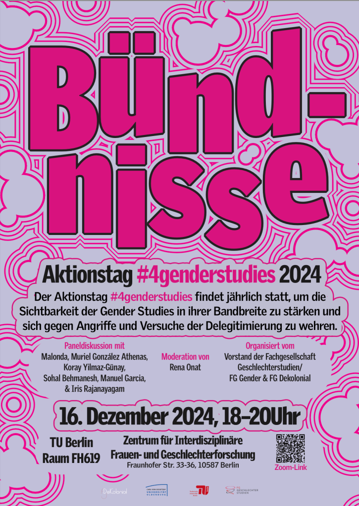 Gemeinsam mit dem Vorstand der FG Geschlechterstudien e.V. laden wir im Rahmen des Aktionstages #4genderstudies herzlich zur Veranstaltung „Bündnisse“ ein, eine Paneldiskussion mit MALONDA, Koray Yılmaz-Günay, Sohal Behmanesh, Manuel Ricardo Garcia, Iris Rajanayagam und Muriel González Athenas, moderiert von Rena Onat.